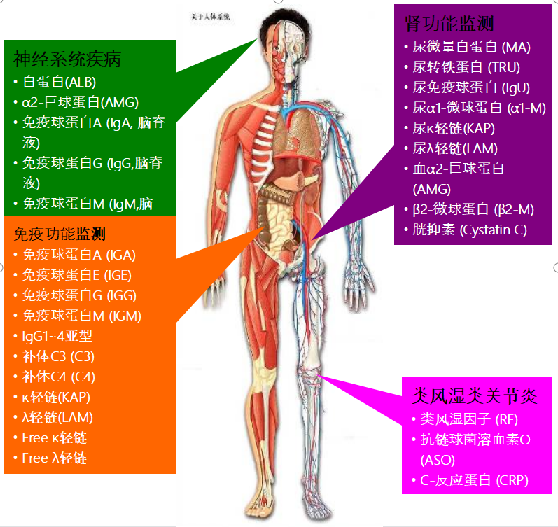 特定蛋白:在人体血清中含有许多蛋白质,它们来源于组织细胞,是血清中含有的功能蛋白,执行着各种功能,很多疾病都可以引起血清蛋白质的变化,蛋白质具有良好的抗原性,利用蛋白质的抗原性,可以采用抗原-抗体反应对具有某一特定抗原性的蛋白质进行测定,故又称特定蛋白检测,可存在于血液、脑脊液、尿液等体液中。