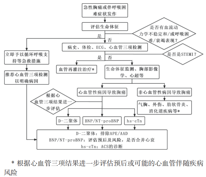 急性胸痛伴呼吸困难患者心血管三联标志物联合应用流程图