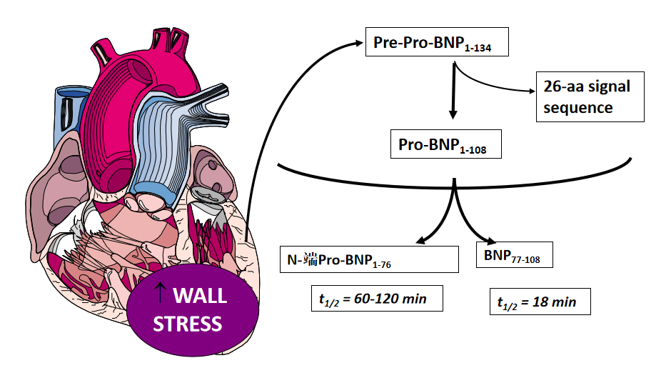 NT-proBNP是一个很好的反映心功能的指标,它对诊断慢性充血性心力衰竭(心衰)具有高度的敏感性、特异性,在2001年已被列入欧洲心脏病协会最新制定的心力衰竭指南中。BNP主要由心室合成,最初合成为含134个氨基酸的prepro-BNP,之后切去N端26个氨基酸的信号肽成为含108个氨基酸的proBNP,再进一步被内肽酶切割,成为含N端76个氨基酸的NT-proBNP和含C端32个氨基酸的BNP,释放人血。由于 NT-proBNP与BNP是等摩尔释放,因此二者在心血管系统疾病的诊断、治疗监测和预后方面有着相似的临床应用。